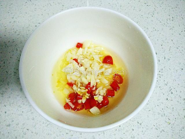 5.锅里放少许油烧热,加入小米椒结、蒜粒爆香。