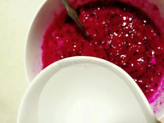 2.把火龙果切开,将果肉弄到容器里,再把果肉捣成糊。