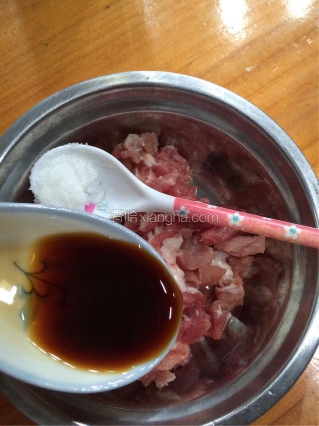 2.肉末加入一勺酱油和半勺盐腌制。