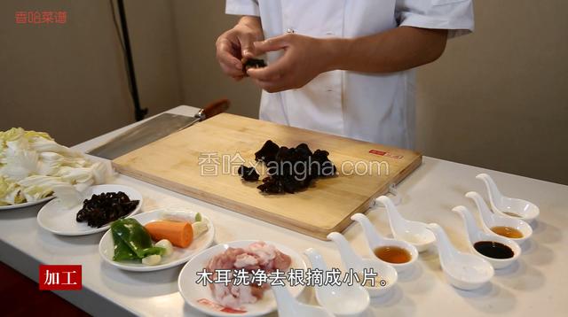 5.在锅中倒入清水300克左右,大火烧开,放入木耳、胡萝卜、青椒、白菜片焯透后,用漏勺控水备用