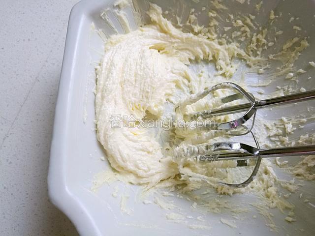 6.打发到黄油稍微地变浅,体积稍微膨大就可以了。