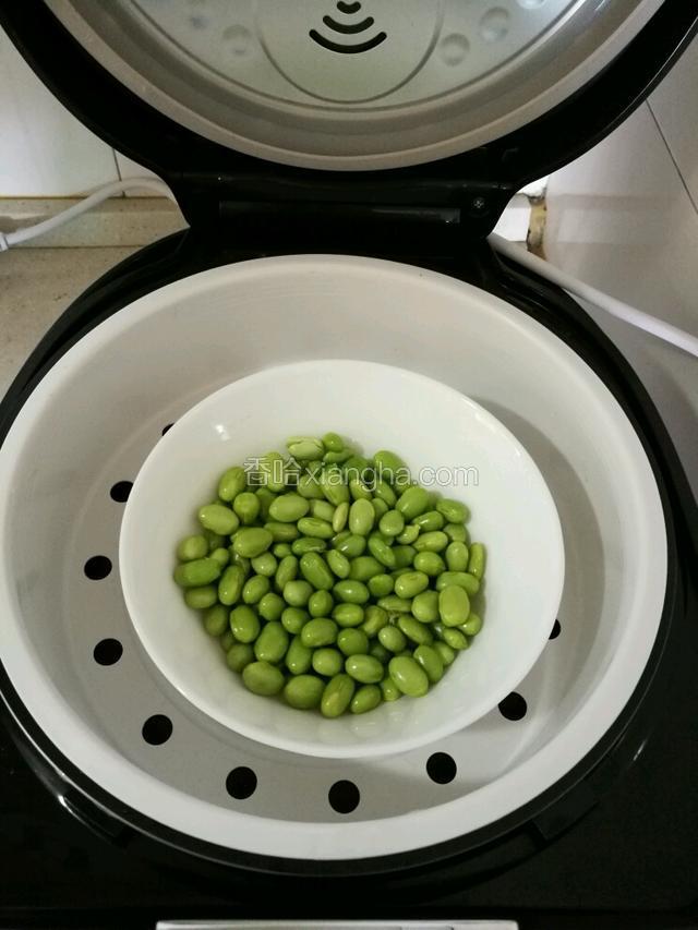 2.将毛豆去皮,把豆子剥出来,放入清水中搓洗干净,拿来隔水蒸20分钟左右,我是煮饭的时候隔水真的,这样省事 。 (我个人不太喜欢拿来炒,太多油了,豆子也不那么容易熟,炒出来也没那么营养了)