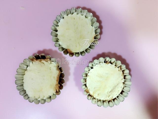 2.吐司印出于模具底部一样大小的形状 涂层黄油 放入模具中