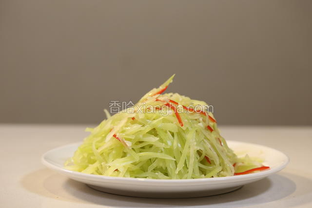1.去皮的青笋洗净,顺斜刀切0.5厘米的薄片,然后顶刀切细丝。