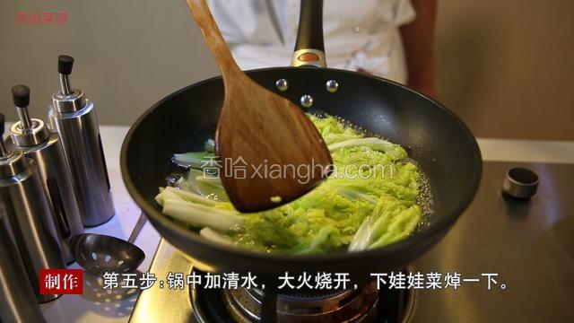 6.锅中加入清水,转大火烧开,下入切好的娃娃菜焯一下