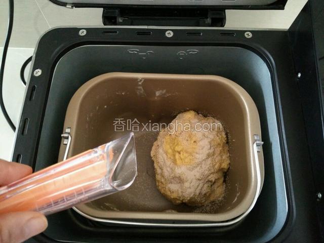 6.将面粉,南瓜泥,糖,盐放入面包机,压任意键启动面包机