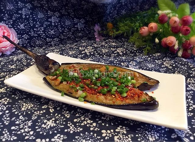 5.茄子从中间剖开,刷上油,盐、酱油少许,大蒜末铺茄子上