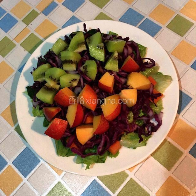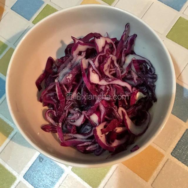 5.紫包菜清洗去掉多余的盐份,均匀的铺在黄瓜和红萝卜上