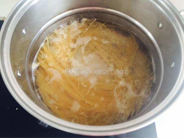 6.汤锅加水烧开,把意面放进去煮,这个过程大概有八九分钟,中小火慢煮