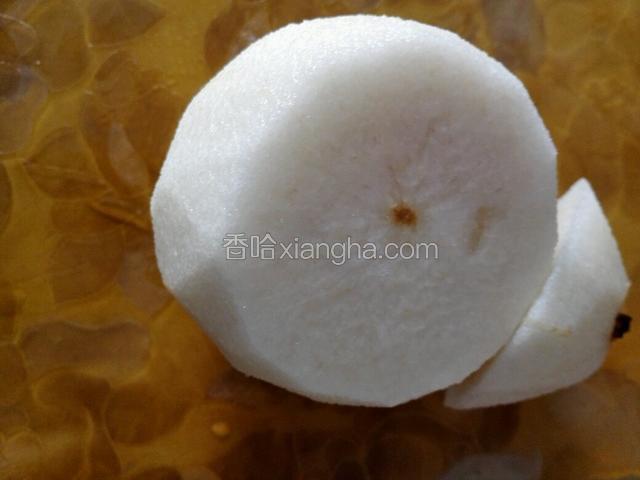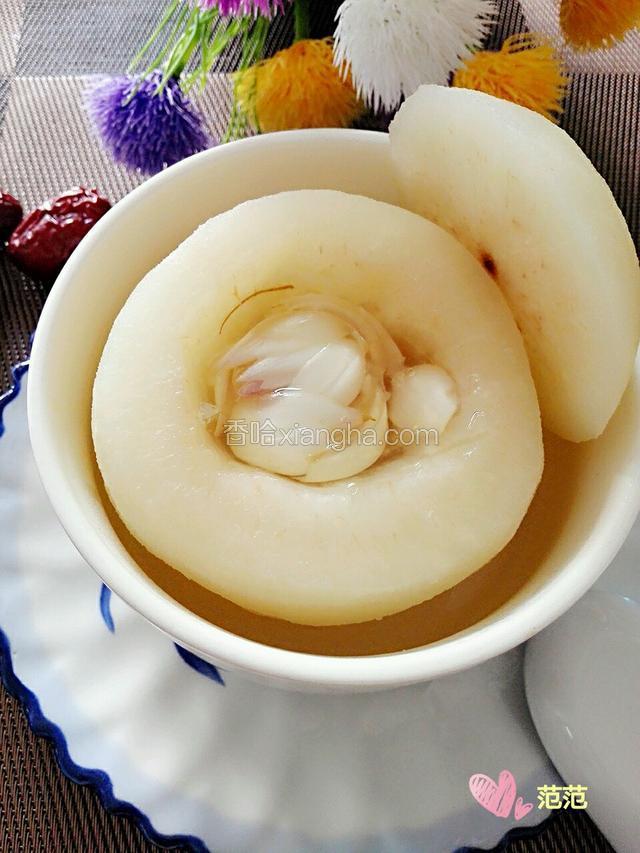4.挖去梨芯,把百合花瓣一片片掰开洗净然后放入雪梨盅。