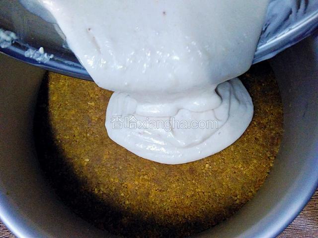 4.饼干碎中加入融化成液态的黄油搅拌均匀。