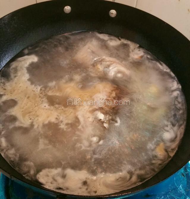 6.倒入开水至没过鱼头,盖上盖子,大火煮5分钟转小火煮10分钟