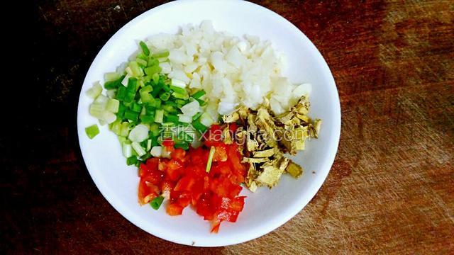 6.生姜,大蒜,葱,红辣椒切碎备用。