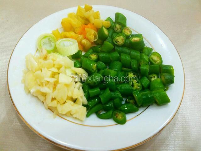 4.姜和大蒜切成末,葱,泡椒和青椒切成小段。