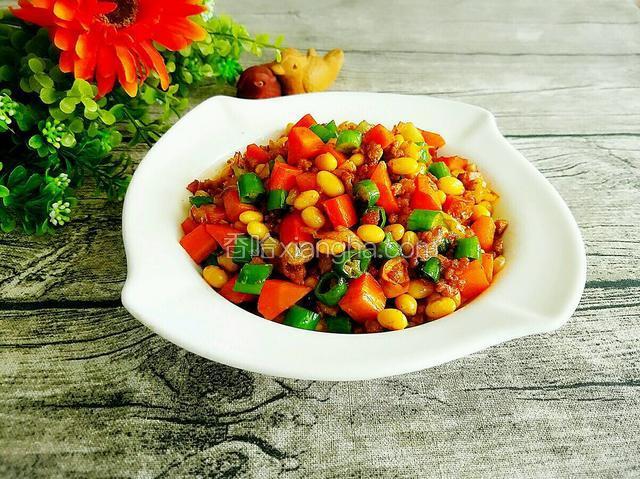 5.黄豆和胡萝卜先煮熟,黄豆先下锅煮,煮得差不多熟时放入胡萝卜一起煮,胡萝卜煮五成熟就可以了。