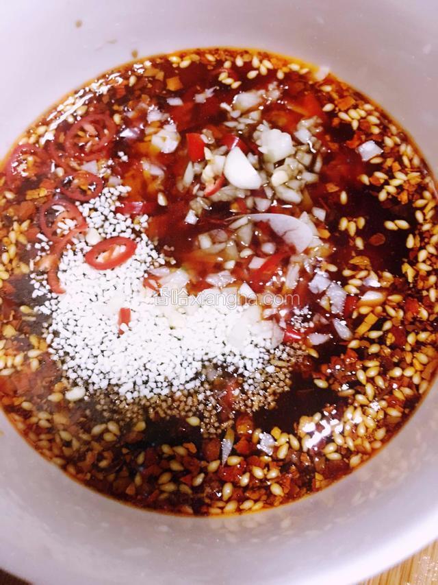 5.准备干净的小碗加入辣椒油、花椒油、藤椒油、香油、醋、酱油、蒜、小米椒、盐、鸡精拌匀