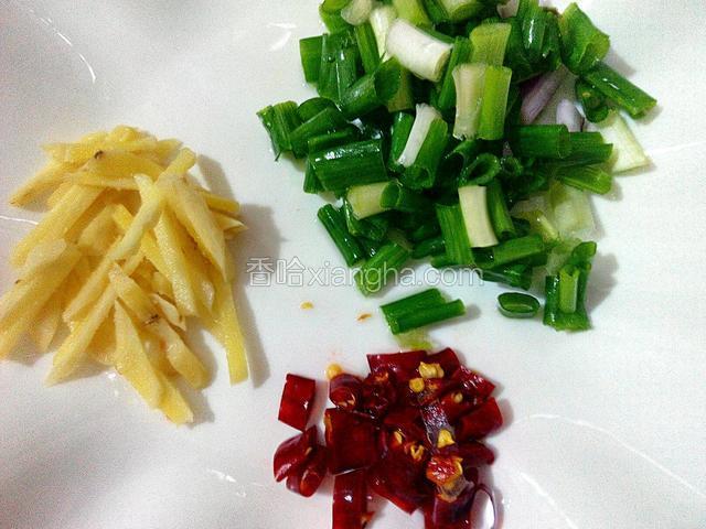 3.清洗干净、葱切成葱花、辣椒干切粒、姜去皮切丝