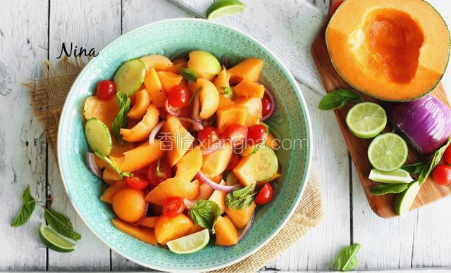 3.将黄瓜片、圣女果、洋葱丝和哈密瓜放在碗中,用橄榄油、苹果醋、盐和黑胡椒搅拌混合,然后入冰箱里冷藏半小时。