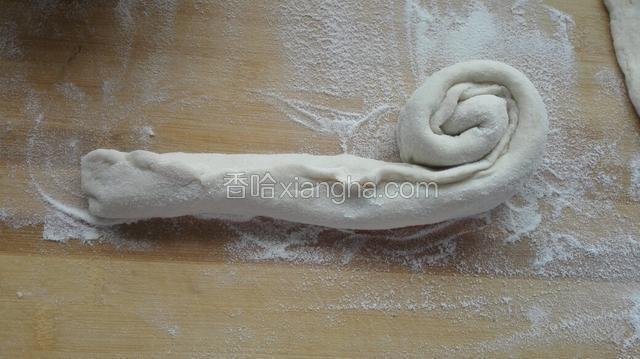 4.松弛好的面团分成大小相同小面团,擀成薄片涂上油酥!