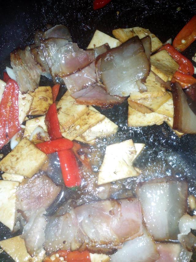 4.坐锅放油,下入蒜和辣椒小火煸一分钟,再下豆干炒一分钟,放盐和酱油炒匀。