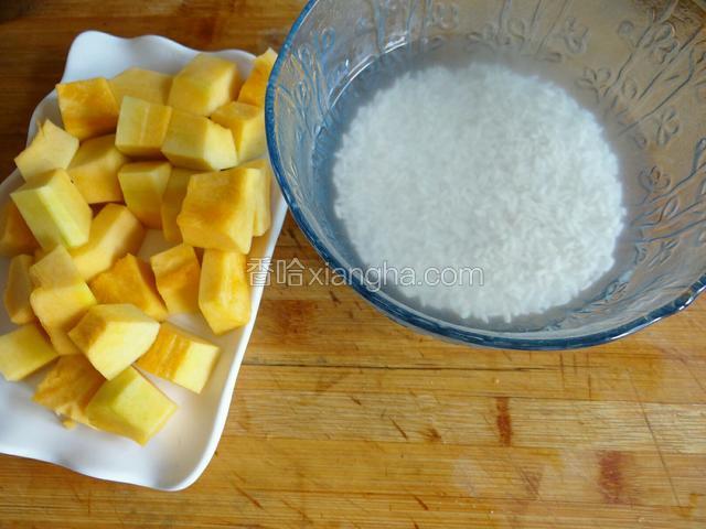 1.糯米洗两遍!用凉水提前泡半个小时,南瓜洗净去皮切成小块!