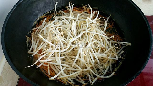 3.再放入绿豆芽焯约一分钟,捞出过凉水备用。