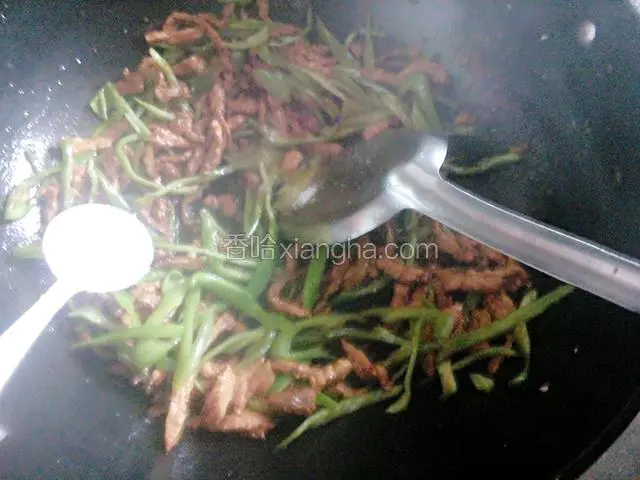4.放入姜丝爆香,倒入肉丝翻炒