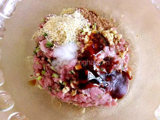 2.姜、葱切碎粒、放入肉馅中,根据自己的口味加适量的盐、花椒粉、鸡精、食用油、蚝油搅拌均匀。