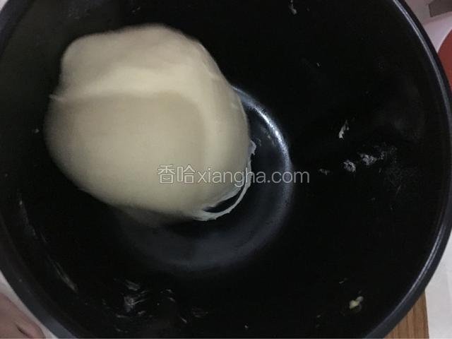 1.除黃油外,其它材料分角放入和面机和面20分钟。
