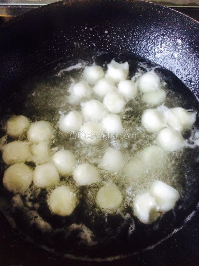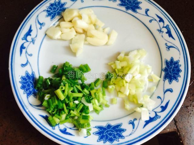 1.准备好食材:半个西葫芦、做好的肉圆4个、毛豆一小把、胡椒2个、葱一把、蒜头4瓣、芡粉少许。