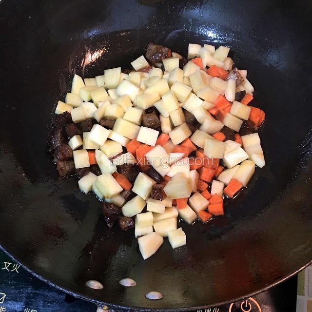 5.接着倒入切好的红萝卜和土豆丁