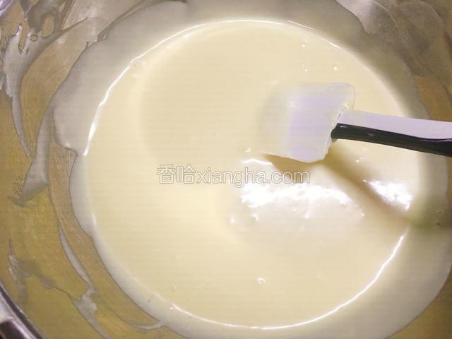 6.下图为体积2倍大的蛋黄液,蛋黄液中一点一点加入糖水,边加入糖水边用电动打蛋器搅打蛋黄液,直到蛋黄液发白体积变大。