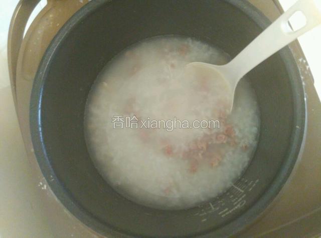 4.把肉丁和姜片倒入煮好的粥里搅拌好,加热两分钟。