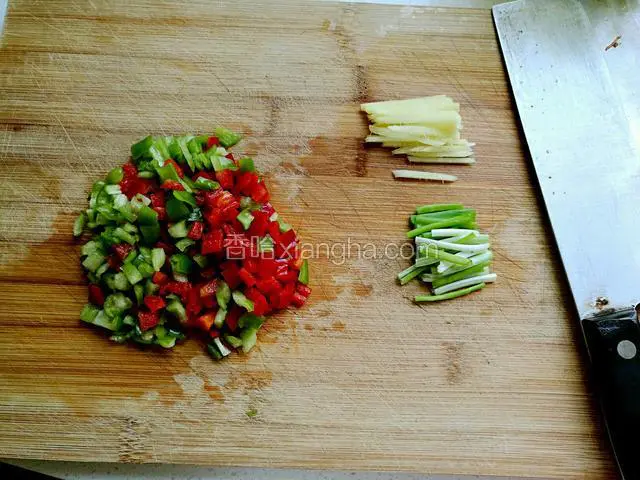 5.姜切丝,香葱切成小段,红椒和青椒切成小丁。