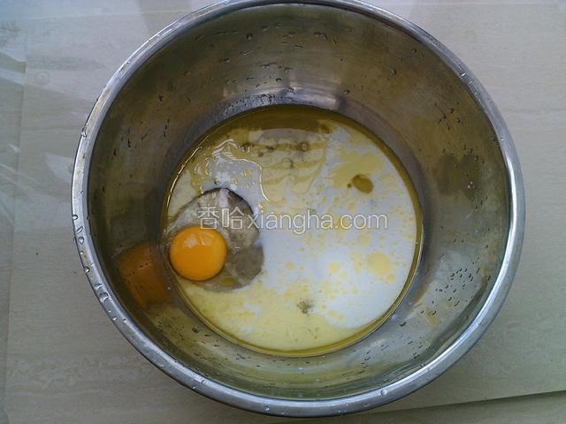 3.将融化好的黄油倒入一个大一点的碗里(最好是不锈钢的),加入鸡蛋。