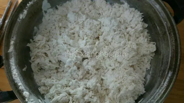 2.慢慢倒入面粉里,一边搅拌一边倒直到面粉成絮瓣状