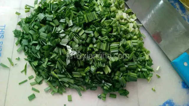 5.韭菜剁碎和猪肉搅匀待用,馅料有菜要倒入适量油,如果干的话可以加入一勺水搅匀