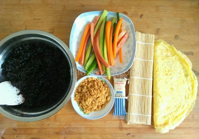 4.焖米饭的时候,将其它的食材全部弄好,黄瓜,胡萝卜洗净切条,火腿肠切条。