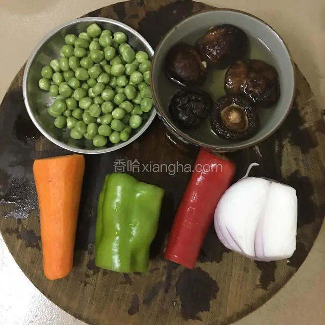 2.香菇泡发,豌豆洗净,胡萝卜、洋葱去皮洗净,青,红椒去头洗净备用。