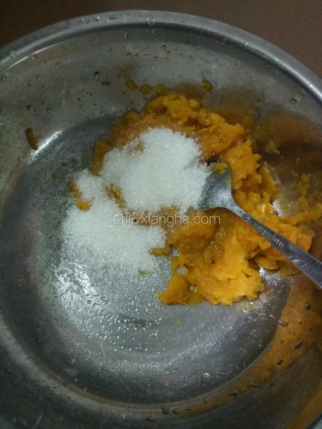 2.南瓜用微波炉高火叮8-10分钟熟了拿出来趁热加入白糖拌匀