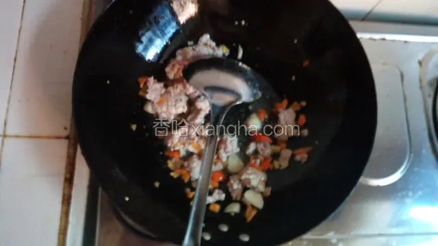4.锅内放油,把姜和肉末放进去,肉末炒到变色就把辣椒和蒜放进去炒香,放一点点盐,一点料酒去腥,适量美味鲜