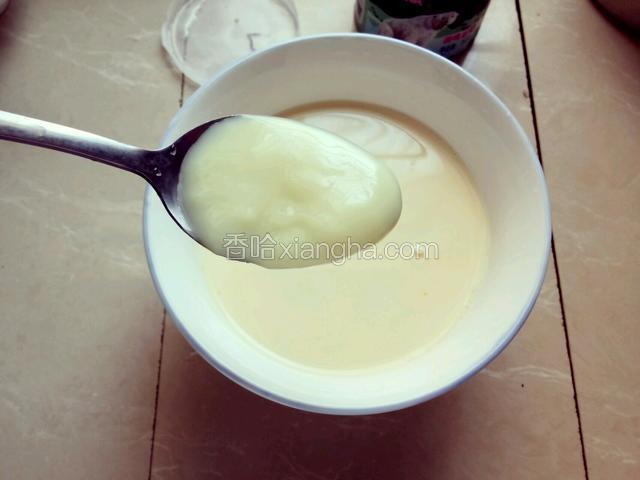 6.加热后的牛奶液放凉,等牛奶不烫手后,将鸡蛋液分次加入牛奶液中。(每加一次都要搅拌均匀)