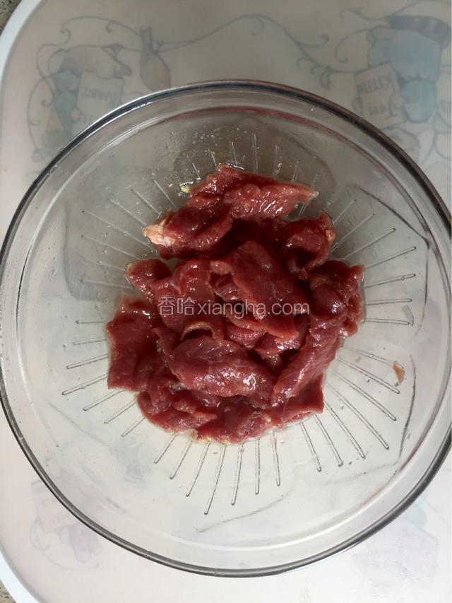 2.牛肉去筋膜,洗净后放用清水浸泡半小时,捞出沥干水分,横着纹理切成薄片。