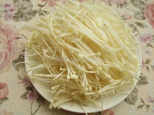2.烧一小锅热水,放一勺盐,把金针菇放入焯水两分钟,然后捞到凉水中过凉