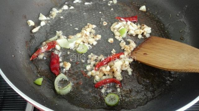5.另起锅,锅热倒入适量油,放入葱姜蒜沫,麻椒,小米椒小火炒香!