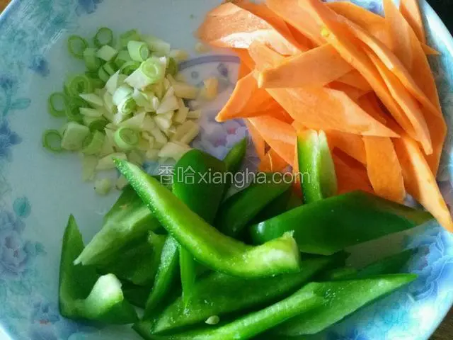 2.葱蒜切末,胡萝卜,青椒切菱形块