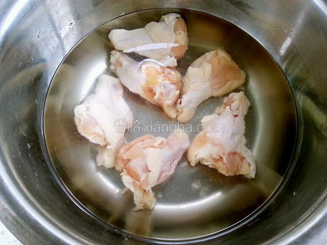 2.将鸡翅根放凉水中煮开,捞出洗去浮沫、控水