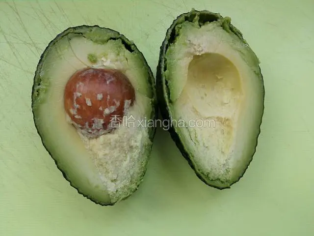 2.牛油果用刀切开,去掉果核。