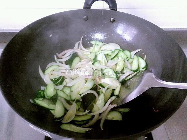 5.锅里留底油大火烧热,下入姜、蒜、洋葱大火翻炒至六七成熟下入切好的黄瓜片翻炒,然后放入盐、鸡精、胡椒粉炒至黄瓜变软加入炒好的鸡蛋翻炒均匀,勾水淀粉大火翻炒几下淋入香油出锅装盘。