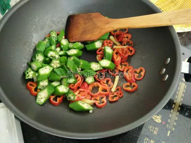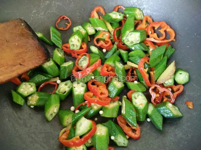 6.当红辣椒炒到稍微发软时放入黄秋葵。